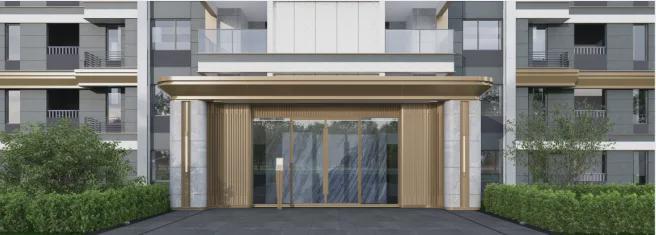建筑整体形态遵循中国铁建樽系列产品线要求,樽系列产品取义于国宝四羊方尊,彰显产品的尊贵的气质。立线直陈如山间飞瀑,水平舒展的横线条,端正如苍鹰展翼。线脚舒展,乌铜走金(金属勾边),铸造工艺细致精湛,尽显高贵。